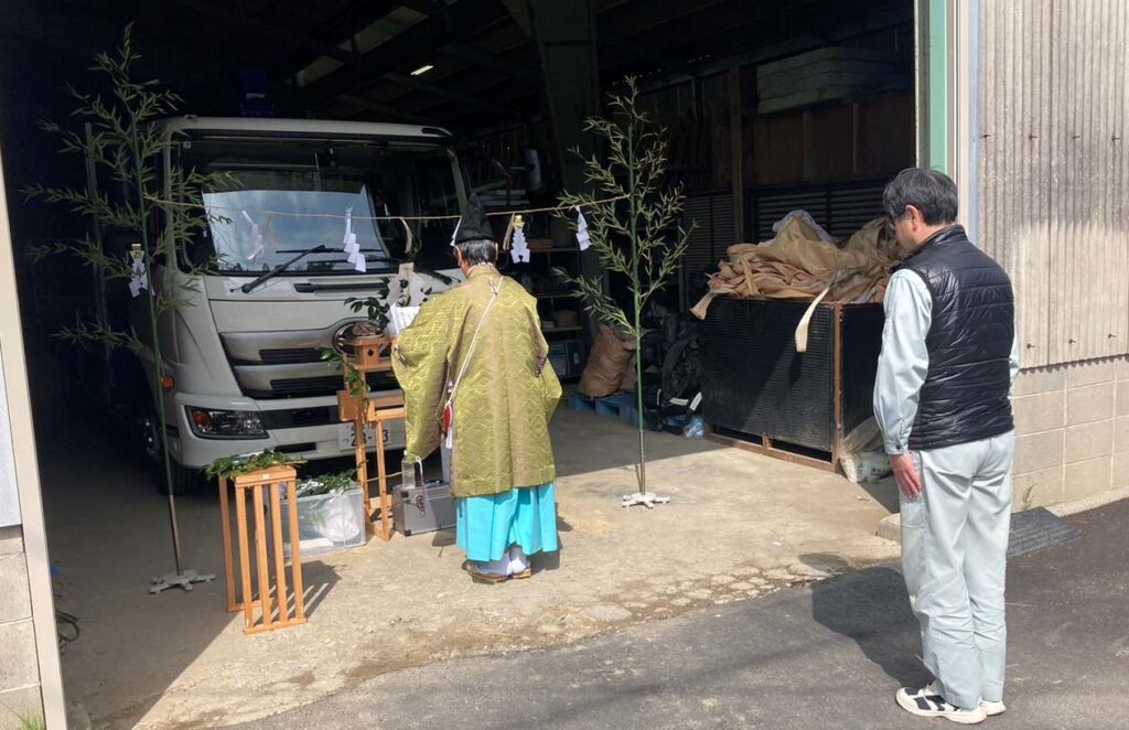 先日、新たに購入した4tトラックの納車に伴い、安全祈願のお祓い式を執り行いました。